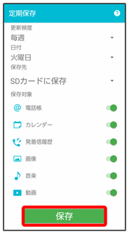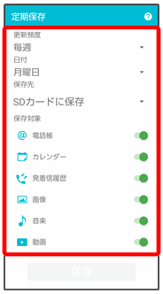 電話帳、カレンダー、発着信履歴、画像、音楽、動画のデータは、サーバー/SDカードにそれぞれ1日に各100個まで保存できます。