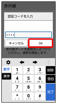 認証コードは、正しい通信相手かどうかをお互いに確認するための暗証番号です。送信側/受信側で同じ数字(4桁)を入力します。特に決まった数字ではなく、その通信限りのものです。