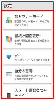 | 音とマナーモード | 着信音、操作音など、音に関する設定ができます。 詳しくは、「音の設定」を参照してください。 |