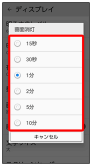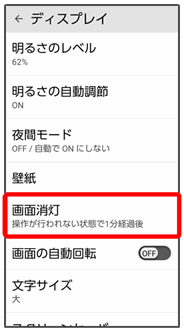 | 画面消灯 | 一定時間操作をしなかったときに、画面が自動消灯するまでの時間を設定します。 | |