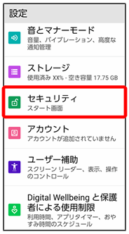 | デバイス管理アプリ | 端末を管理するアプリの確認と、有効/無効の設定をします。 | |