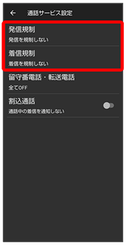 | 着信規制 | ・全ての着信を規制 すべての着信を規制します。 ・国際着信を全て規制 日本以外での着信を規制します。 ・着信を規制しない 着信規制をすべて解除します。 |