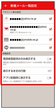• ↓新着メール一覧設定画面でアプリ起動時に表示する