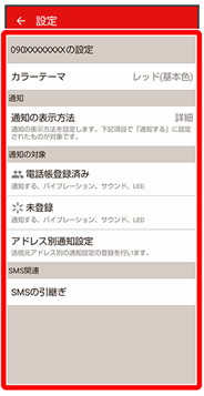 | 電話帳登録済み | 電話帳に登録済みの相手からメールを受信したときの通知方法を設定します。 | |