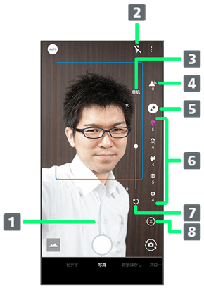 2背景ぼかしアイコンまたはAQUOS beauty機能設定アイコンをタップすると、表示されます。