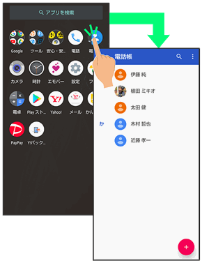 | 電話をかけたり、受けたりすることができます。海外に電話をかけるときも使用します。 通話履歴を表示して発着信を確認したり、履歴から相手に発信することもできます。 |