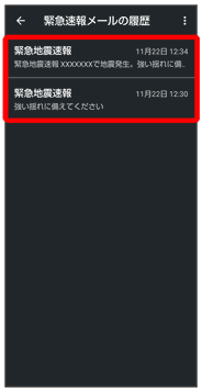 緊急速報メール受信メッセージ一覧画面が表示されます。