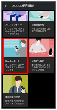 | かんたんモード | 簡単で見やすいホーム画面と読みやすい文字に設定できます。 | |