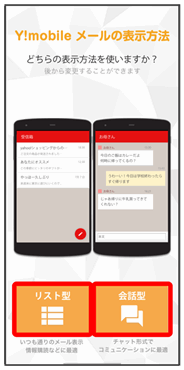 Y!mobile メールの設定中に、メールの表示方法を「会話型」と「リスト型」から選択できます。また、表示方法はあとから切り替えることができます。詳しくは、「会話型表示/リスト型表示について」を参照してください。