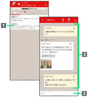 会話型表示では、宛先ごとに送受信したメールをまとめて表示します。たとえば、山本さんとやりとりしたメールを確認するときは、1つのスレッドの中で山本さんと会話をしているように表示されます。