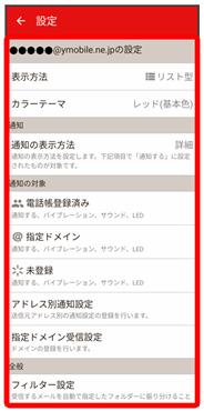指定ドメイン 指定ドメインに登録した相手からメールを受信したときの通知方法を設定します。