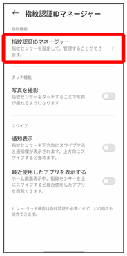 • 指紋センサーに指を触れたまま指紋の登録や認証を開始すると、起動できない場合があります。指を離し、再度操作してください。