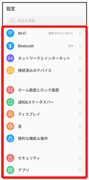 | ネットワークとインターネット | モバイルネットワーク、データ使用量など、ネットワークやインターネットに関する設定ができます。 | |