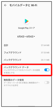 バックグラウンドデータの通信 バックグラウンドデータの通信を制限します。詳しくは、「バックグラウンドのモバイルデータ通信を制限する」を参照してください。