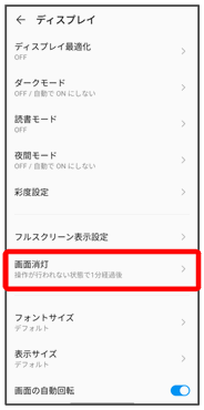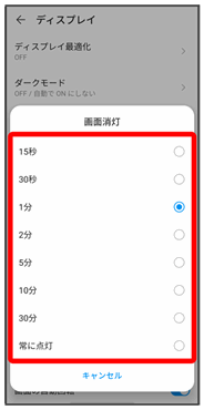 | 画面消灯 | 一定時間操作をしなかったときに、画面が自動消灯するまでの時間を設定します。 | |