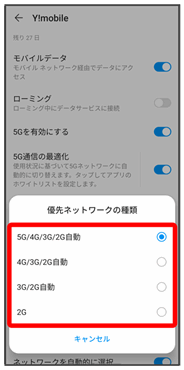 • お買い上げ時は5G/4G/3G/2G自動に設定されています。日本国内や3Gネットワークの通信事業者のみの地域で本機を使用する場合は設定を変更する必要はありません。