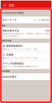 | 未登録 | 電話帳に未登録の相手からメールを受信したときの通知方法を設定します。 | |