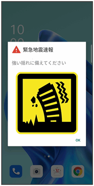 メッセージが表示され、緊急地震速報/災害・避難情報個別の警告音およびバイブレータでお知らせします。