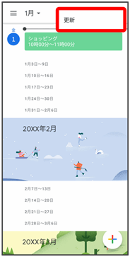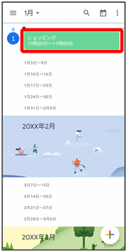 • カレンダーの表示を「月」に設定しているときは、確認する日付をタップしたあと、確認する予定をタップしてください。