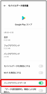 | バックグラウンドデータの通信 | バックグラウンドデータの通信を制限します。詳しくは、「バックグラウンドのモバイルデータ通信を制限する」を参照してください。 | |