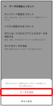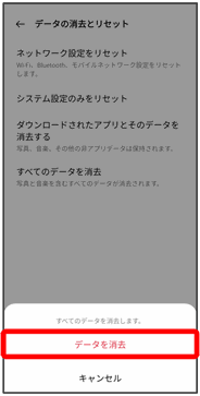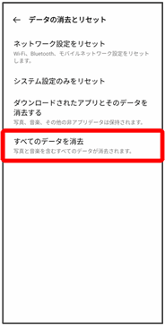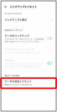 | バックアップとリセット | SDカードを使用したデータの保存や読み込み、Google アカウントを使用したバックアップの設定、システム/アプリおよび初期状態へのリセットができます。 |