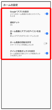 | Google™アプリを表示 | 最初のホーム画面の左のシートに、Google アプリを表示するかどうかを設定します。 | |