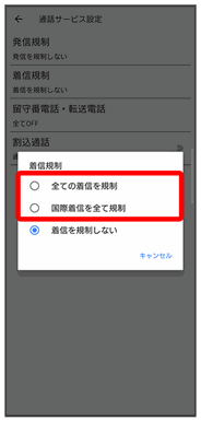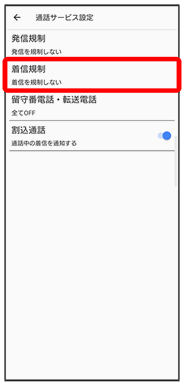 • 着信規制をすべて無効にするときは、着信を規制しないをタップします。