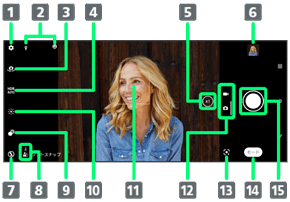 1「スマイルシャッター」や「位置情報を保存」を設定した場合のアイコンなどが表示されます。