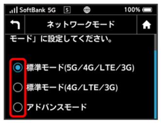 アドバンスモードで本機を利用できるように設定します。お買い上げ時のネットワークモードは「標準モード(5G/4G/LTE/3G)」に設定されています。