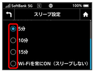本機が無線LAN端末と接続されていない状態で、本機の操作を一定時間行わなかったときや、本機を充電していないときは、省電力のためにスリープモードになります。スリープモードに移行するまでの時間を設定できます。お買い上げ時は5分に設定されています。また、スリープ設定をOFFに設定し、スリープモードに移行しないようにすることもできます。