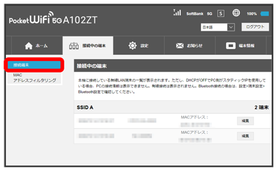「接続中の端末」タブで接続している端末を確認したり、接続できる端末を制限したりします。