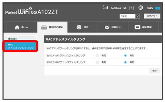 - マルチSSID機能(SSID B)をONにしてWi-Fi名(SSID B)へ接続していた場合も、MACアドレスフィルタリングの対象となります。