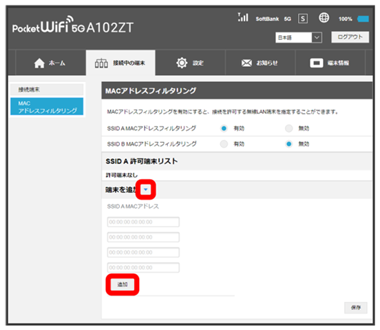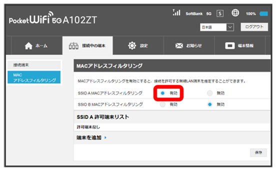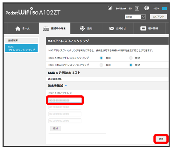 本機に無線LAN接続した端末で、WEB UIのMACアドレスフィルタリングを有効にする場合は、接続している端末のMACアドレスを追加して保存することを忘れないようご注意ください。