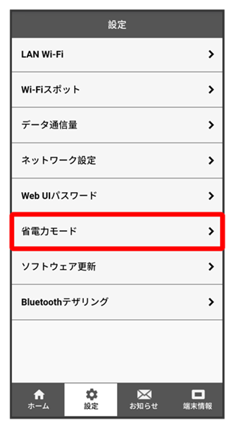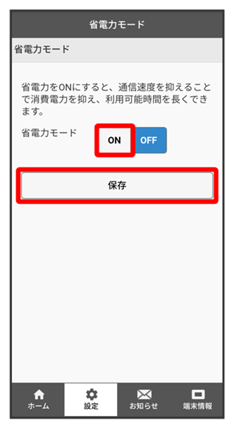 省電力モードをONにすると、モバイルネットワーク、Wi-Fiの通信速度が抑えられ、下り最大約2Mbpsまで制限されます。