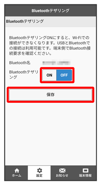 - BluetoothテザリングをONにすると、無線LAN機能が無効になります。無線LAN接続中の機器は接続が切断されますのでご注意ください。