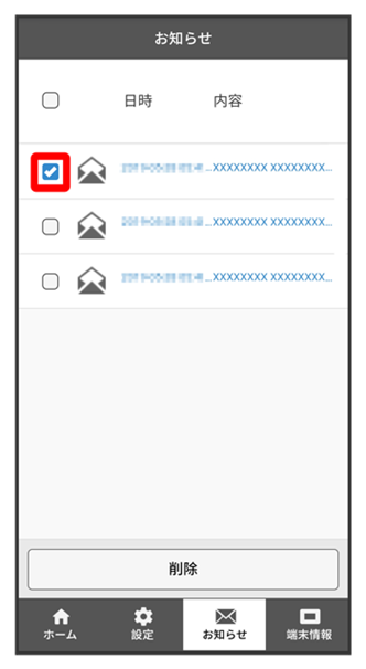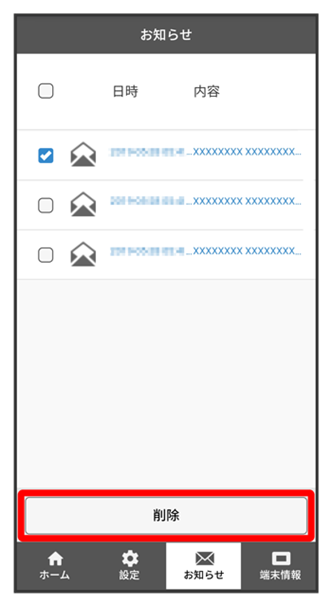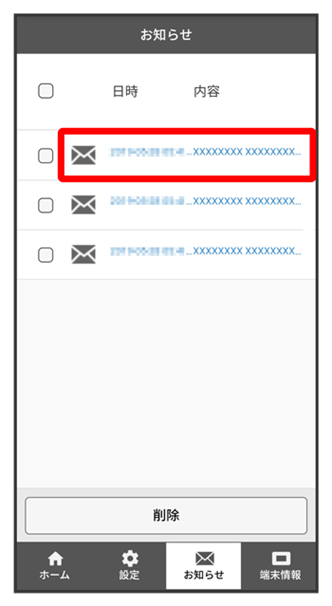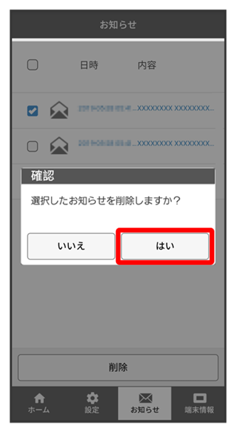 新しいお知らせを受信した場合、本機のホーム画面のタッチメニューにお知らせの件数が表示されます。モバイル機器のWEB UIで操作中は、「お知らせ」メニューからお知らせを確認できます。