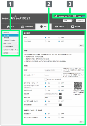 | 受信レベルのアイコン: モバイルネットワークの受信レベルをアイコンで表示します。 ネットワークオペレーター表示: 接続中のネットワークオペレーター名を表示します。 ネットワークの種類: 5G/4G/LTE/3Gのいずれかを表示します。 ネットワークモード: 利用中のネットワークモードを表示します。 通信時間: 接続してから現在までの通信時間を表示します。 データ通信量: 接続してから現在までの送信/受信データ通信量を表示します。 接続ボタン: ネットワークへの自動接続が失敗した場合に、手動で接続します。 SSID A: Wi-Fi名(SSID A)に接続中の機器の端末名を表示します。 SSID B: Wi-Fi名(SSID B)に接続中の機器の端末名を表示します。マルチSSID機能(SSID B)がONの場合にのみ表示されます。 |