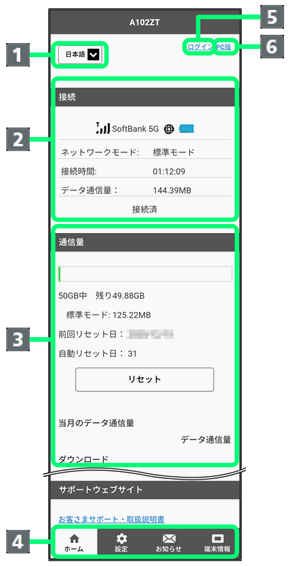 | 受信レベルのアイコン: モバイルネットワークの受信レベルをアイコンで表示します。 ネットワークオペレーター表示: 接続中のネットワークオペレーター名を表示します。 ネットワークの種類: 5G/4G/LTE/3Gのいずれかを表示します。 電池残量のアイコン: 電池残量をアイコンで表示します。 ネットワークモード: 利用中のネットワークモードを表示します。 接続時間: 接続してから現在までの通信時間を表示します。 データ通信量: 接続してから現在までの送信/受信データ通信量を表示します。 接続ボタン: ネットワークへの自動接続が失敗した場合に、手動でネットワークに接続します。 |