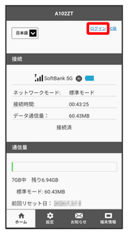 画面右上に「ログアウト」ボタンが表示され、ログインが完了します。メインメニューの項目(設定/お知らせ/端末情報)をタップしてログインした場合は、それぞれのページが表示されます。