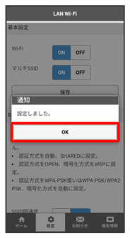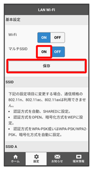 Wi-Fi名(SSID A)のLAN Wi-Fi基本設定が設定されます。