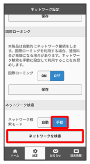 モバイルネットワークを検索して、ネットワークを設定できます。日本国内では、自動モードのみご利用になれます。設定の変更はできません。