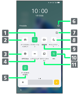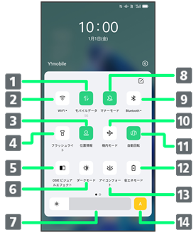 通知バーを下にフリック/スワイプすると、コントロールセンターを開くことができます。コントロールセンターでは、アイコンをタップして機能のON/OFFなどを設定できます。