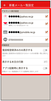 • 新着メール一覧設定画面で電話帳登録済みのみ表示する