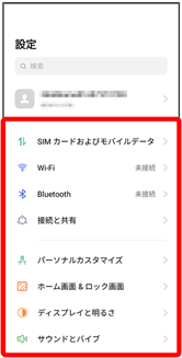 | SIM カードおよびモバイルデータ | SIMカードやネットワーク、データ使用量などの情報確認および設定ができます。 | |