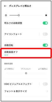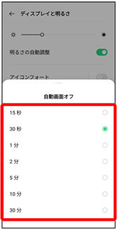 | 自動画面オフ | 操作を行わなかった場合に画面消灯する時間を設定します。 | |
