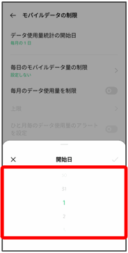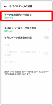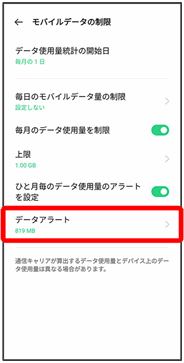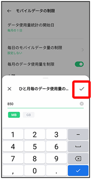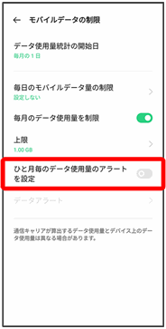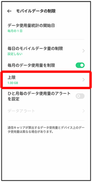 • 毎月のデータ使用量を制限が有効のときに設定できます。