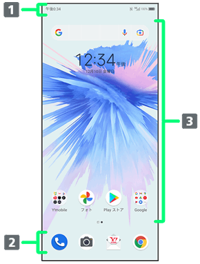 | アイコンをタップすると、アプリや機能を起動できます。お好みのアプリのショートカットを最大5つまで配置できます。フォルダを配置することもできます。 | ||
