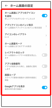 | レイアウトのロック | ホーム画面のレイアウトを固定するかどうかを設定します。 | |