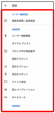 | 周辺のスポット | ・周辺のスポット 周辺のスポットの検索結果を表示するかどうかを設定します。 ・検索結果のカスタマイズ 検索履歴を含めた検索結果を表示するかどうかを設定します。 ・Googleアカウント 電話のアカウントを設定します。 ・位置情報の設定 位置情報を利用するかどうかを設定します。 |