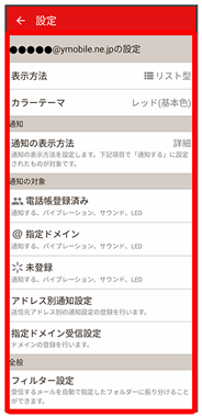 | 指定ドメイン | 指定ドメインに登録した相手からメールを受信したときの通知方法を設定します。 | |
